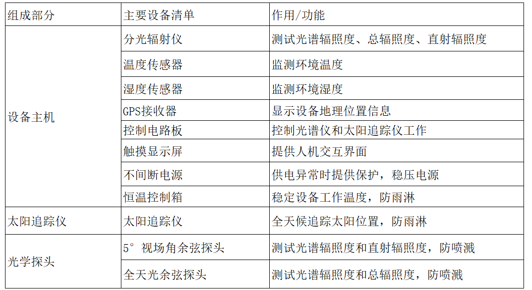 太陽光譜輻照測量應用包括科學氣象、氣候觀測、材料測試研究,太陽能電池板效率和太陽能可再生能源的評價等。在大氣層外,太陽光譜可以看作為全波段的電磁波譜,但是在地表,由于大氣環境的影響,太陽光譜會存在很多特征,也正是基于此,戶外太陽光譜的監測越來越多的被用于獲得太陽的發光特性,了解光在大氣中的傳輸規律,以實現對大氣組分的監測。